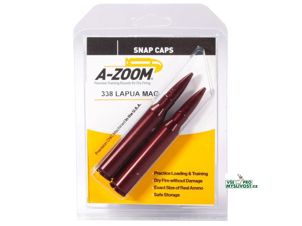 Velmi kvalitní lakovaný cvičný náboj pro ráži 338 Lapua Magnum. Tělo náboje má hladkou povrchovou úpravu, díky které se snadno zavádí do komory. Cvičné náboje A-Zoom jsou skvělou volbou pro ty, kteří si potřebují nastavit bicí mechanismus, i pro ty, kteří si doma chtějí jen "sušit". Vhodné pro suchý trénink i pro vybití zbraně se skrytým kohoutem. Cena za 2ks.
