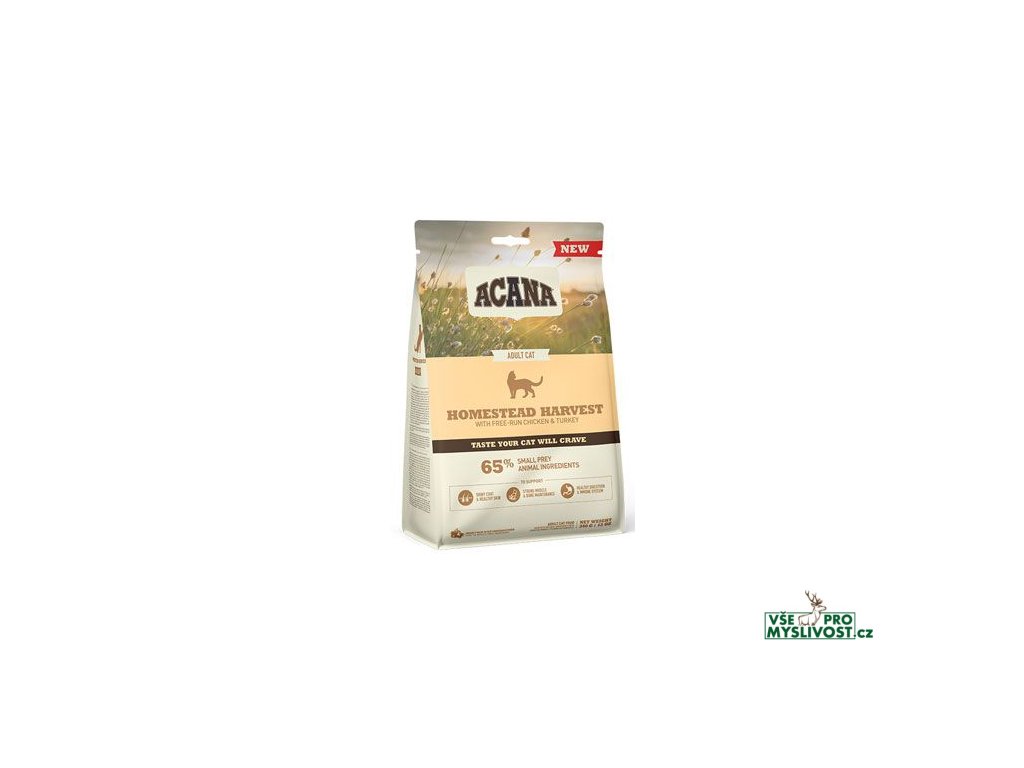 ACANA HOMESTEAD HARVEST CAT - volně chované kuře a krůtaUdělejte radost vaší kočce touto skvělou recepturou plnou živočišných surovin. NOVINKA ACANA Homestead Harvest je nabitá kvalitními ingrediencemi včetně volně chovaného kuřete, krůty a kachny v bohatě vyživujícím poměru celé kořisti (maso, orgány, chrupavky a kosti). Tak získává vaše kočka přirozeně potřebné živiny, které ji udržují šťastnou, zdravou a silnou.
