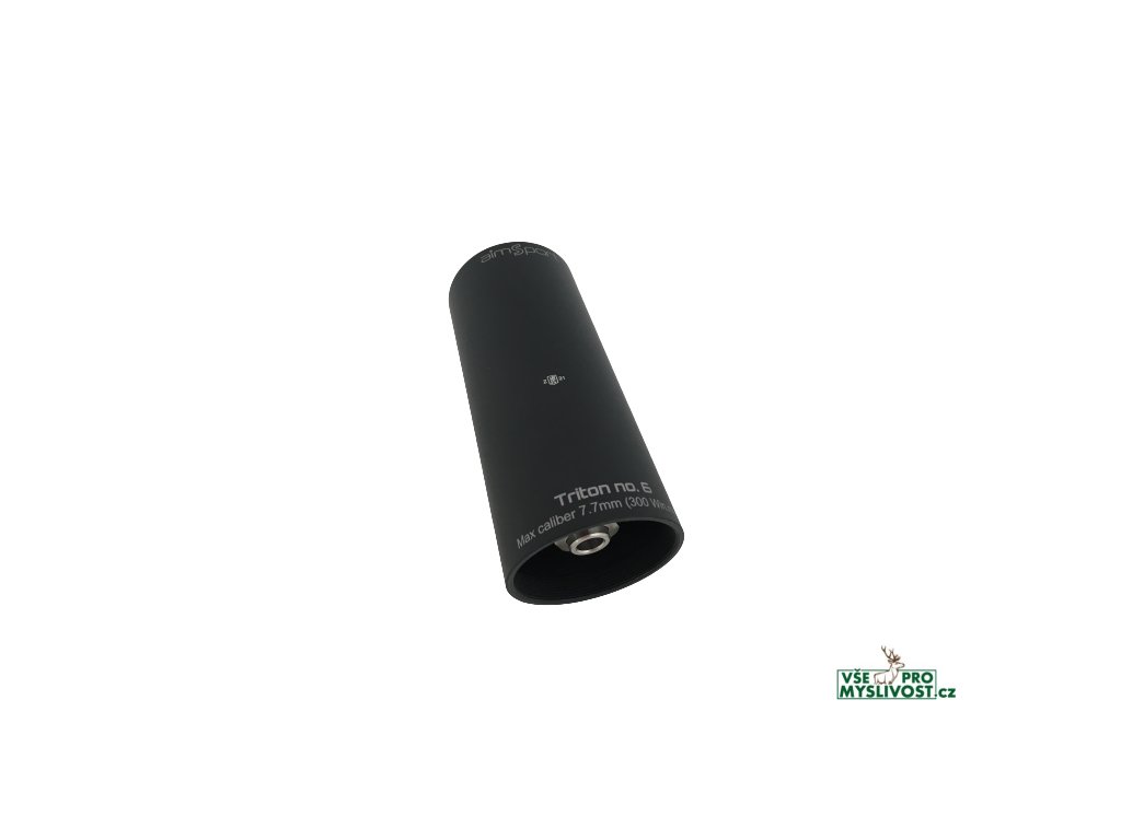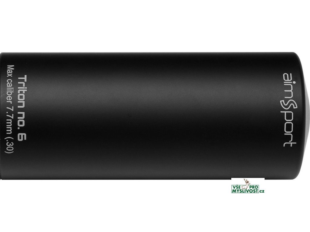 Tlumič Aimsport Triton No.6 představuje ten nejefektivnější tlumič od výrobce Aimsport, vyvinutý i na ty největší magnumové ráže. Spolu s tím neprodlužuje hlaveň více než Triton 5. Tělo tlumiče je opatřeno povrchovou úpravou SoftTouch, která chrání tlumič proti poškrábání, je příjemná na dotek a snižuje hlučnost když s tímto tlumičem někde zavadíte na posedu. Jedná se o tzv. teleskop konstrukci. Celková délka tlumiče Triton No.5 je 25cm a hmotnost činí 490g. Tyto jeho vlastnosti obalu z leteckého hliníku spolu s jádrem z nerezové oceli přinášejí útlum hluku až o 34dB.
