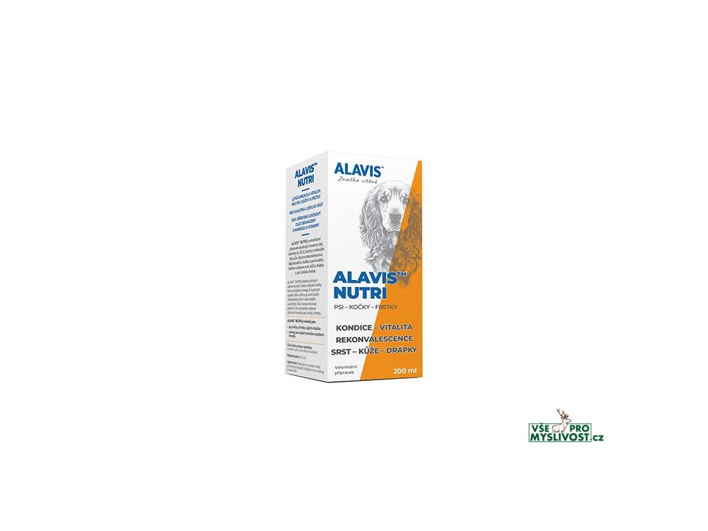 ALAVIS™ Nutri je veterinární přípravek obsahující lososový olej, vitaminy (A, D3, E, biotin) a minerální látky (Zn, Se) pro rekonvalescenci, lepší kondici a vitalitu a pro kvalitní, lesklou a zdravou srst, kůži a drápky u psů, koček a fretek.