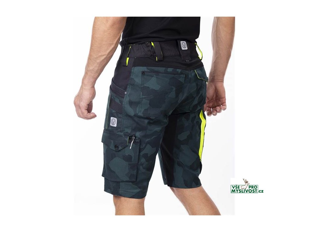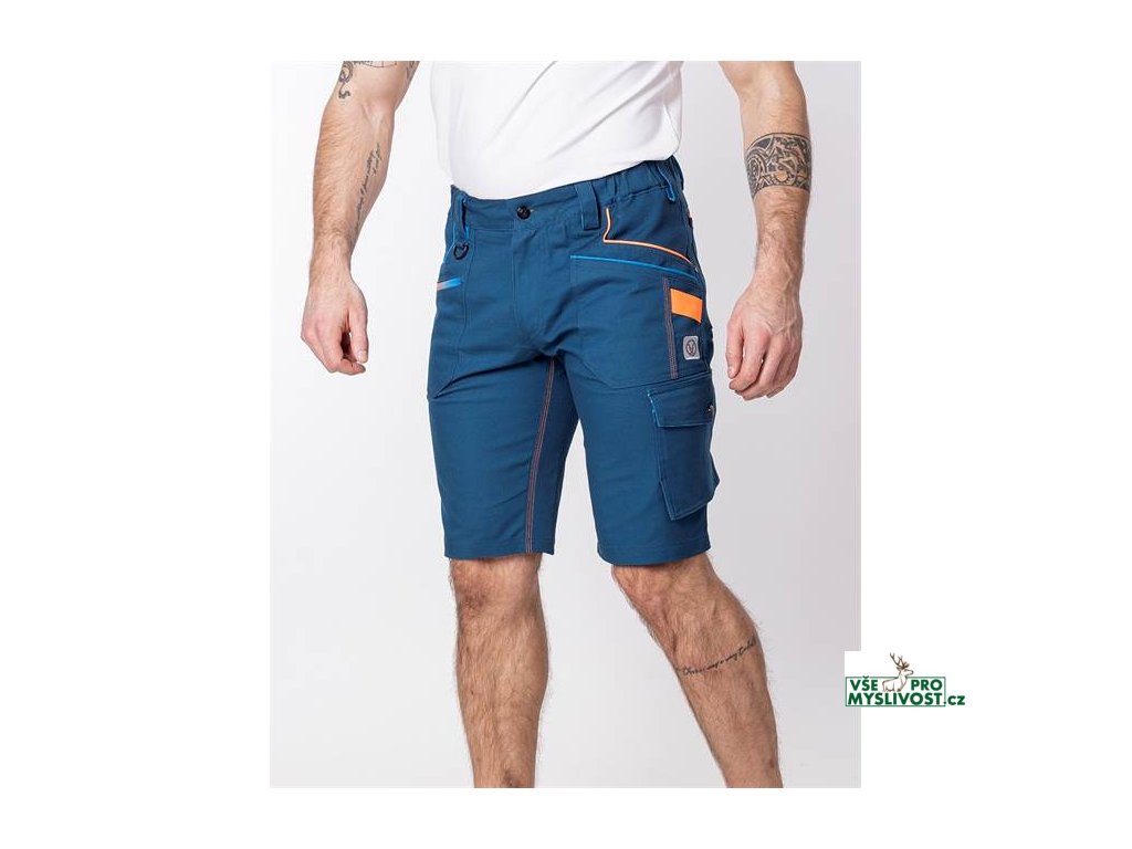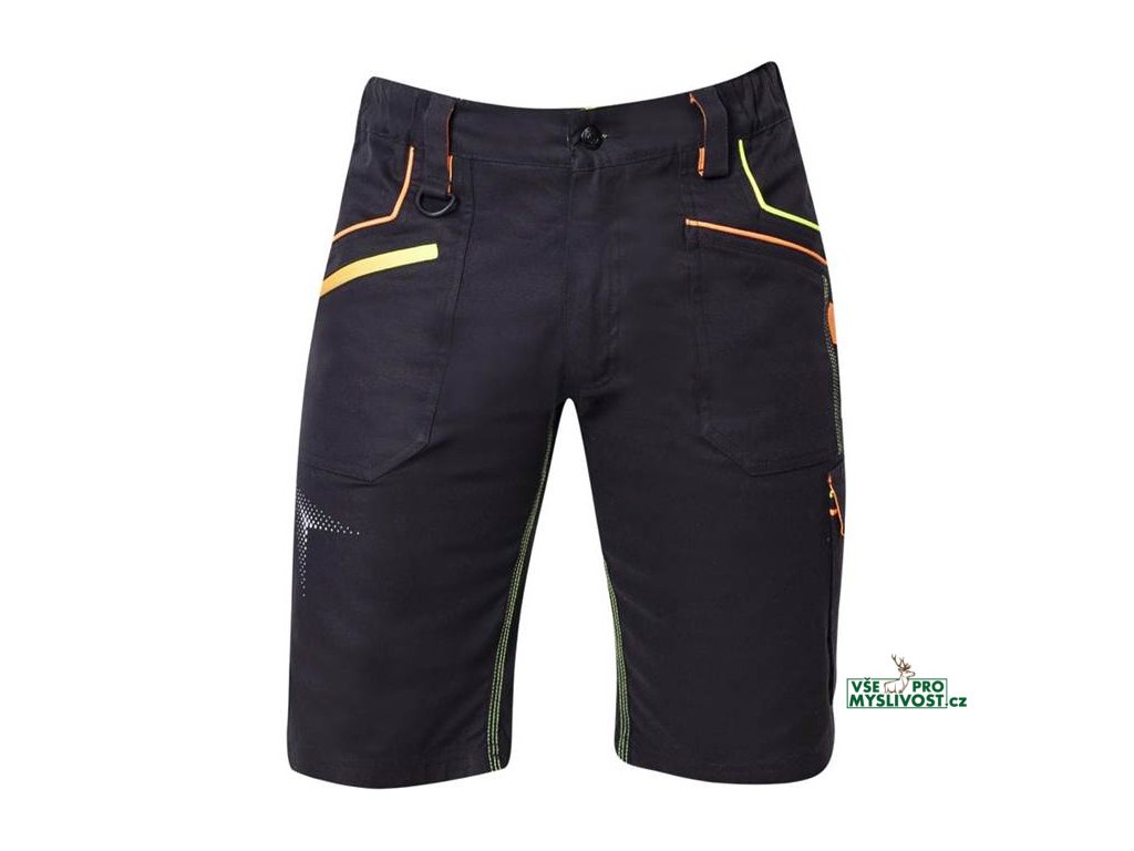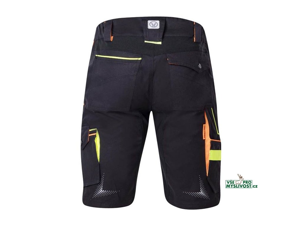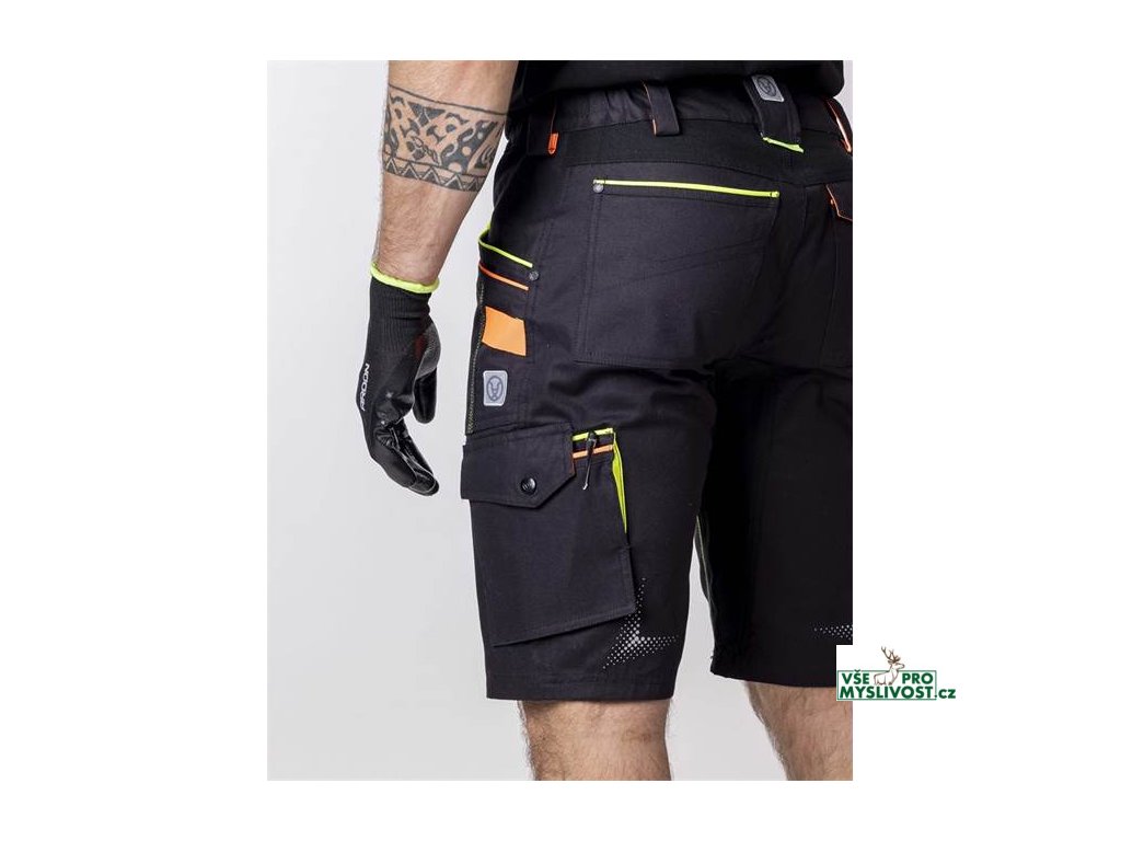Strečové bavlněné montérkové kraťasy ze speciálního materiálu Amalytton®, který vyniká zvýšenou pevností a hladkým, jemným povrchem. Sníženou gramáž oceníte díky příjemnému pocitu při nošení. V exponovaných partiích je použitý odolný a čtyřsměrně elastický materiál Tabiflex®. Kraťasy mají vysoce funkční ergonomický 3D střih SLIM FIT, který zvýrazňuje siluetu. Jsou vybaveny pružným pasovým límcem spolu se skrytým zadním dvojitým poutkem pro pohodlné usazení opasku, vnitřní protiskluzovou páskou, D kroužkem na karabinu, 2 průhmatovými kapsami, 1 přední zipovou kapsou, 1 přední nářaďovou kapsou se širokým poutkem, na pravé nohavici je umístěna multifunkční kapsa na skládací metr, šroubovák a odlamovací nůž se širokými poutky, na levé nohavici je velká dvojitá kapsa krytá patkou na druk. Zadní díl člení sedlo a 2 kapsy, pravá zadní kapsa je krytá patkou na druk, trojité prošití v namáhaných partiích. Zvýšenou viditelnost uživatele zajišťují reflexní pásky.