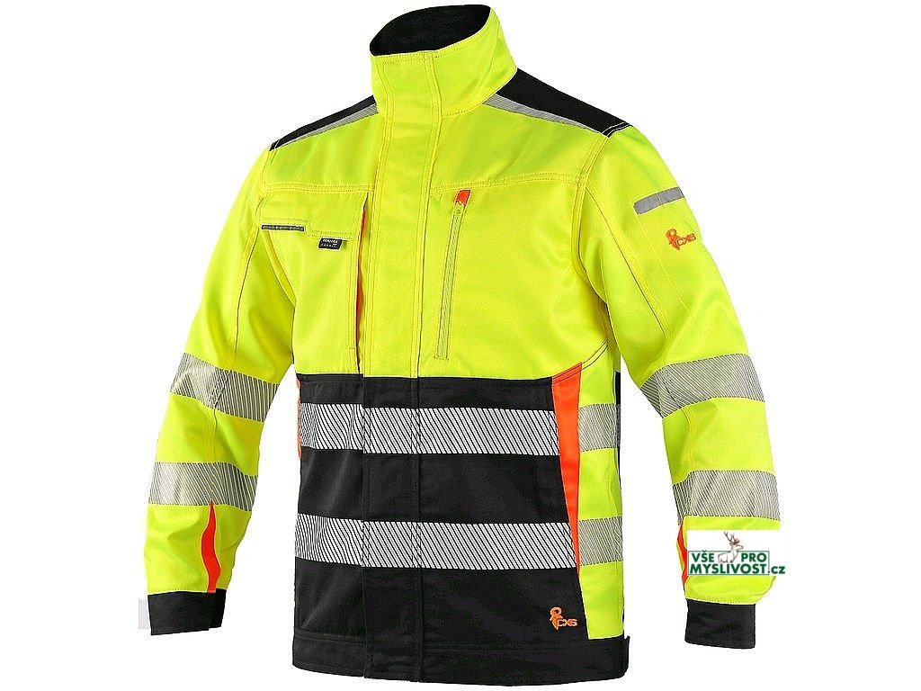 Pánská výstražná blůza, ramena zesílena materiálem CORDURA, rukávy s nastavitelnou manžetou na suchý zip, kryté zapínání na zip, suché zipy a druky, levá náprsní kapsa na zip, pravá krytá klopou, v pravé kapse odnímatelné pouzdro na ID kartu, na levém rukávu kapsička na tužky, boční kapsy na zip, segmentované reflexní pásky (šíře 5 cm), kontrastní žluté/oranžové a reflexní doplňky. Doporučené použití: stavebnictví, silničáři, údržba, logistika, letecká a lodní doprava.
