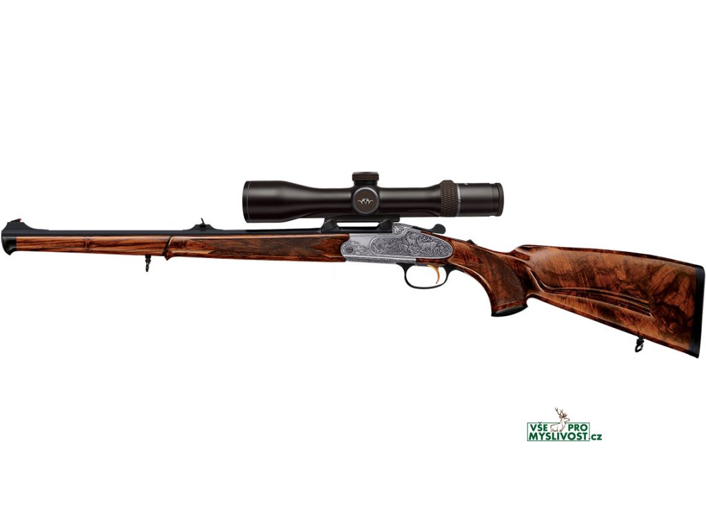 ořechové dřevo kvality 8, kulatý hřbet pažby, dvojitá bavorská lícnice, staroanglická pryžová botka, tulipánovité rozšíření zakončení předpažbí z tmavého ebenového dřeva, prodloužené boční desky zdobené ruční arabeskovou gravurou. Levá strana – jelen a muflon (ovce), pravá strana – srnčí a kamzík. Oboustranně jemná arabeska. Ozdobná osmihranná hlaveň, délka 50 cm, zlacený blok závěru a spoušť, rytina lučíku. ABS transportní kufr a kožený zbraňový řemen.