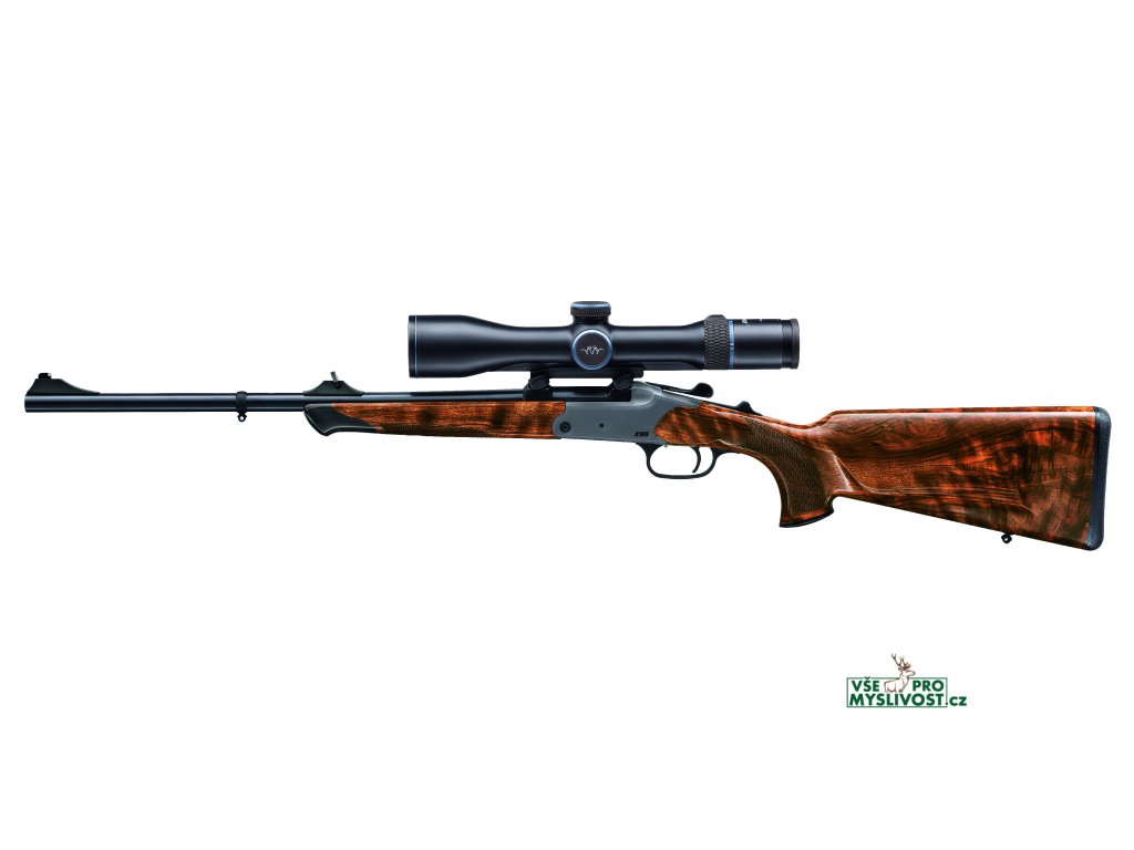 ořechové dřevo kvality 3, rovný hřbet pažby, dvojitá bavorská lícnice, staroanglická pryžová botka, tulipánovité rozšíření zakončení předpažbí, ozdobné zakončení tmavým ebenovým dřevem/příplatek 14.921,- Kč, černé boční desky systému, černá spoušť - provedení Stutzen - stejné jako provedení Standard, délka hlavně 50 cm - 152.665,- Kč
