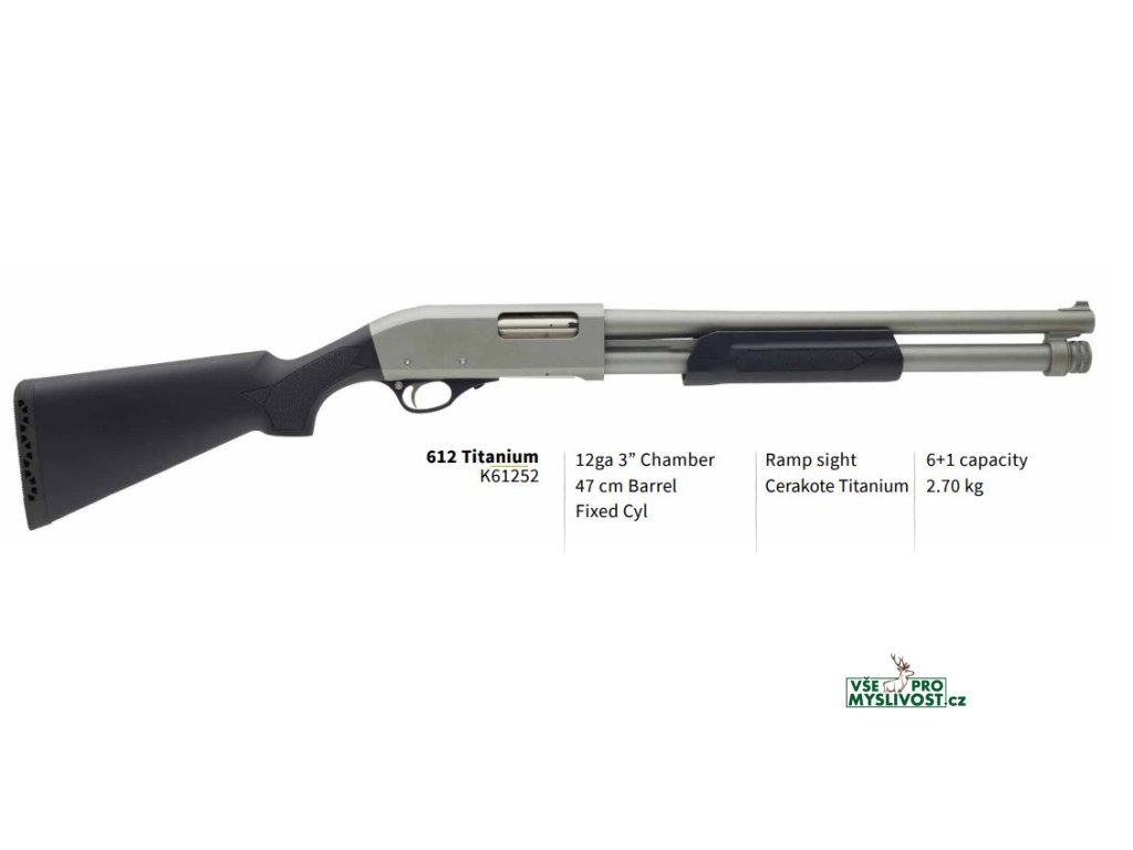 Opakovací brokovnice od předního výrobce, který vyrábí brokovnice i pro řadu světových značek. Zbraň je osazena přední muškou na liště, je bez zahrdlení, v odolné povrchové úpravě Titanium a s ponosovým popruhem
