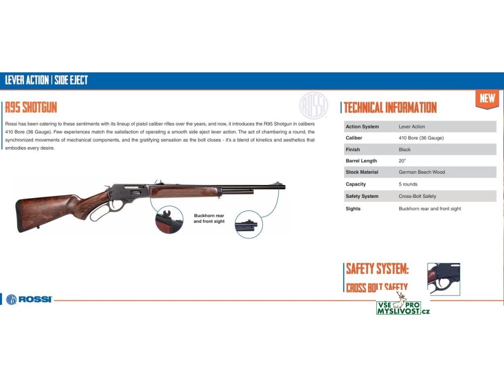 Společnost Rossi v průběhu let vycházela vstříc těmto pocitům díky své řadě kulovnic pistolové ráže a nyní představuje brokovnici R95 v rážích. 410 Bore (36 Gauge). Jen málokterý zážitek se vyrovná uspokojení z ovládání hladkého bočního výhozu pákové zbraně. Samotný akt nabíjení nábojů, synchronizované pohyby mechanických součástí a uspokojivý pocit při zavírání závěru - to je kombinace kinetiky a estetiky, která ztělesňuje všechny touhy