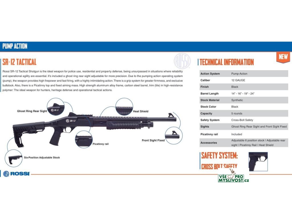 Rossi SR-12 Tactical Shotgun je robustní a spolehlivá pumpovací brokovnice navržená pro policejní, bezpečnostní a obranné úkoly. Díky odolnému hliníkovému rámu, ocelové hlavni a taktickému vybavení (Picatinny top, ghost-ring mířidla, ergonomická rukojeť) nabízí vysokou operační spolehlivost a rychlé ovládání.