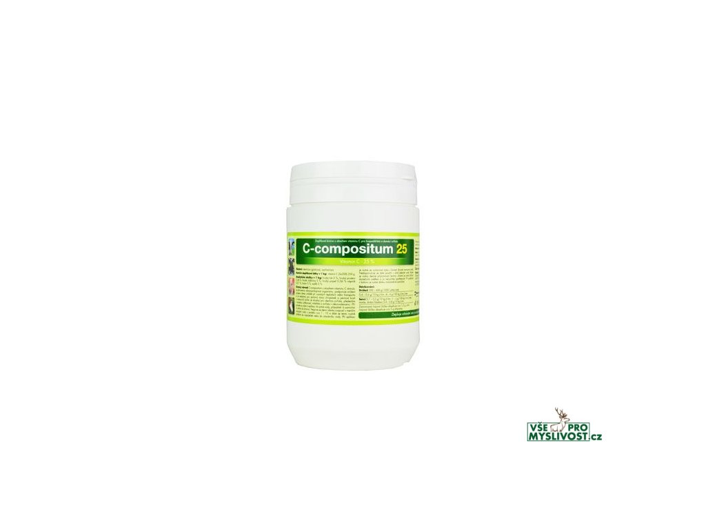C-Compositum 25procent je kompletní krmná přísada biologicky účinných látek. Pomáhá ke zvýšení obranyschopnosti organismu vůči infekčním onemocněním, zejména u mláďat všech druhů zvířat. Při mimořádném zatížení v důsledku transportního a tepelného stresu a při všech stavech vyčerpanosti organismu. Při dermatózách, anémiích, krvácení, při poruchách reprodukce a pro podporu hojení ran a zlomenin. U drůbeže k příznivému ovlivnění snášky a kvality skořápky, pro optimální vývoj embryí kuřat a jejich správný vývoj v preinkubačním období. C-