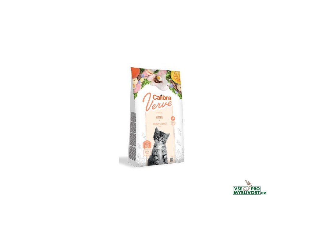 Calibra Cat Verve Kitten Chicken & Turkey je kompletní krmivo bez obilovin s vysokým obsahem čerstvého masa – s kuřetem a krůtou. Receptura je určená pro koťata.Čerstvé maso z kuřete tvoří 27 % celkového obsahu. Proteiny v receptuře jsou z 87,8 % živočišného původu. Toto krmivo tak pro masožravce představuje vysoce výživnou porci, která je zároveň lehce stravitelná, a to i pro citlivé zažívání kotěte. Složení z kvalitních surovin vytváří ten nejlepší základ výživy. Křupavá a nadýchaná konzistence granulí je neodolatelným lákadlem.