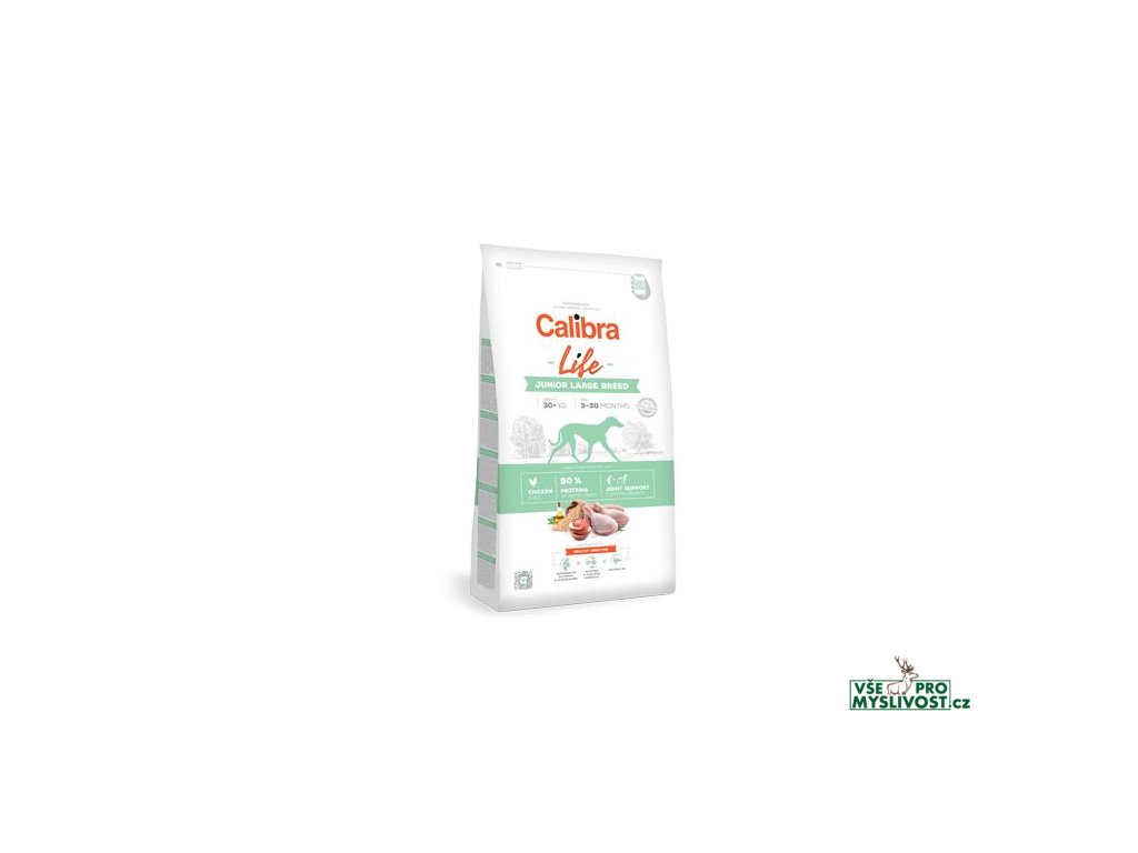 Calibra Dog Life Junior Large Breed Chicken je receptura krmiva pro mladé psy (3–30 měsíců) velkých plemen (nad 30 kg) s kuřecím masem. Obsahem bílkovin živočišného původu ve výši 90 % z celkového obsahu bílkovin vyhovují i nejnáročnějším požadavkům na výživu těchto velkých psů. Receptura je sestavena jako monoproteinová - pouze jeden zdroj živočišných bílkovin. Kompletní krmivo je zároveň hypoalergenní a kvalitní kuřecí maso je kombinováno s rýží. Vysoká výživová hodnota krmiva je doplněna o kloubní výživu, která pomáhá předcházet problémům pohybového aparátu velkých psů v dospělosti. Vitaminy a minerály pomáhají dospívajícím psům v péči o celkové zdraví a imunitu. Zdravou kůži a srst navíc podpoří lososový olej.Funkce hlavních aditiv