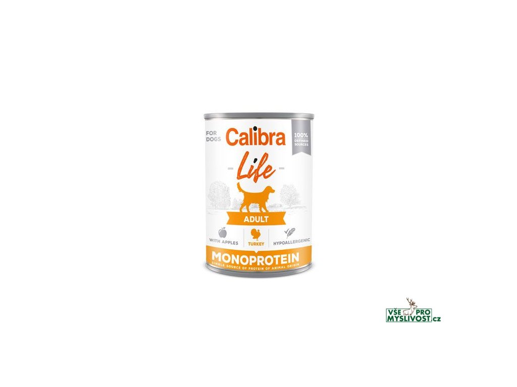 Calibra Dog Life Adult Turkey with Apples - receptura konzervy s krůtím a jablky je kompletním krmivem, které je určené pro dospělé psy.Hypoalergenní receptura je založena na jediném druhu proteinu, je sestavena z omezeného počtu ingrediencí. Složení konzervy je bez obilovin, bez lepku, obsahuje jen suroviny té nejvyšší kvality, které jsou ze 100% definovaných zdrojů, což všechno má vliv na lehkou stravitelnost krmiva.