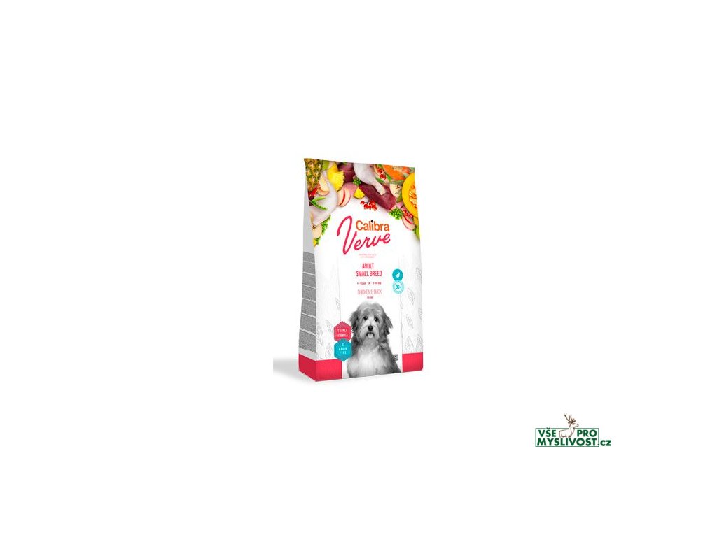 Calibra Dog Verve Adult Small Breed (Chicken & Duck) je kompletní suché krmivo s čerstvým masem a bez obilovin. Receptura je určená pro dospělé psy malých plemen s hmotností 1-10 kg.Vysoký obsah čerstvého kuřecího masa 30 % a kvalitní kachní protein v této receptuře poskytne psovi výživu v souladu s jeho přirozenými stravovacími instinkty a fyziologickými potřebami.Čerstvé maso je vysoce výživným zdrojem bílkovin, který se vyznačuje atraktivní chutí, a je vhodné i pro citlivé zažívání.
