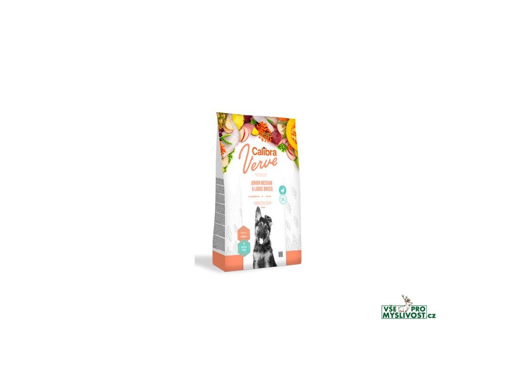 Calibra Dog Verve Junior Medium and Large Breed (Chicken & Duck) je kompletní suché krmivo s čerstvým masem a bez obilovin. Receptura je určená pro mladé psy ve věku 3-30 měsíců středních a velkých plemen s hmotností nad 10 kg.Vysoký obsah čerstvého kuřecího masa 30 % a kvalitní kachní protein je zárukou přirozeně výživné porce, která je v souladu s fyziologickými potřebami psa, potřebné pro správný růst a vývoj mladého organismu.Čerstvé maso je vysoce výživným zdrojem bílkovin, který se vyznačuje atraktivní chutí, a je vhodné i pro citlivé zažívání.