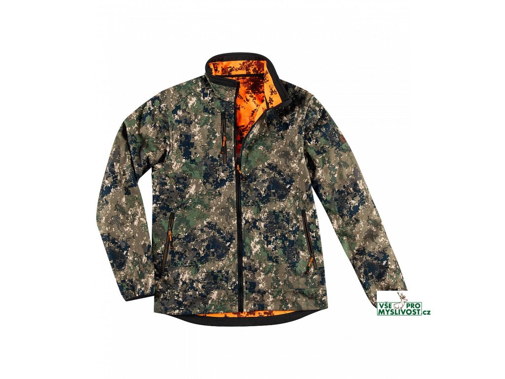 Oboustranná lovecká bunda s digitálním maskovacím vzorem. S TPU membránou, která je vodoodpudivá, větruodolná a prodyšná (5 000 MVP) Elastické manžety