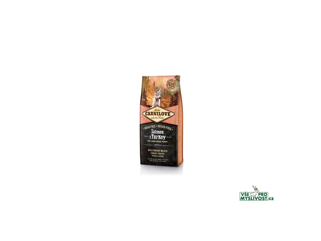 HOLISTICKÉ VYSOCE KVALITNÍ KRMIVO Z LOSOSA A KROCANA BEZ OBILOVIN A BEZ BRAMBOR. VHODNÉ PRO ŠTĚŇATA VELKÝCH PLEMEN ≥ 25 KG, 3 30 MĚSÍCŮ.Losos je zdrojem vysoce stravitelných proteinů. Je bohatým zdrojem omega-3 nenasycených mastných kyselin, které pozitivně ovlivňují mentální vývoj, kardiovaskulární soustavu a metabolismus (snižují obsah krevního cukru). Losos má pozitivní vliv na kvalitu a vzhled srsti a kůže. Krocan je bohatým zdrojem stravitelných proteinů s vysokým obsahem stopových prvků, zejména zinku. Dále obsahuje vitamíny B 3 a B 6, které ovlivňují činnost mozku, svalový tonus a jsou nezbytné pro zdravý růst.