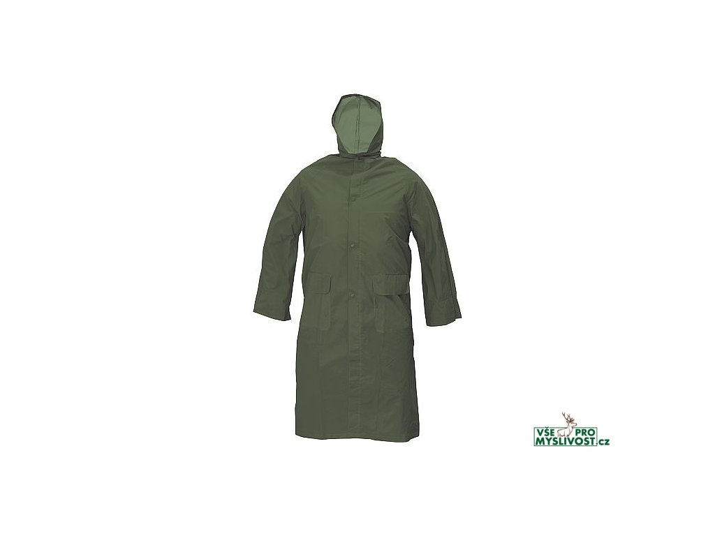• voděodolný ¾ plášť s kapucí, prodloužená délka • všechny spojovací švy jsou zatavené • materiál s nánosem PVC • dvě přední kapsy kryté légami proti průniku vody • vnitřní manžeta na gumu • ventilace na zádech a v podpaží