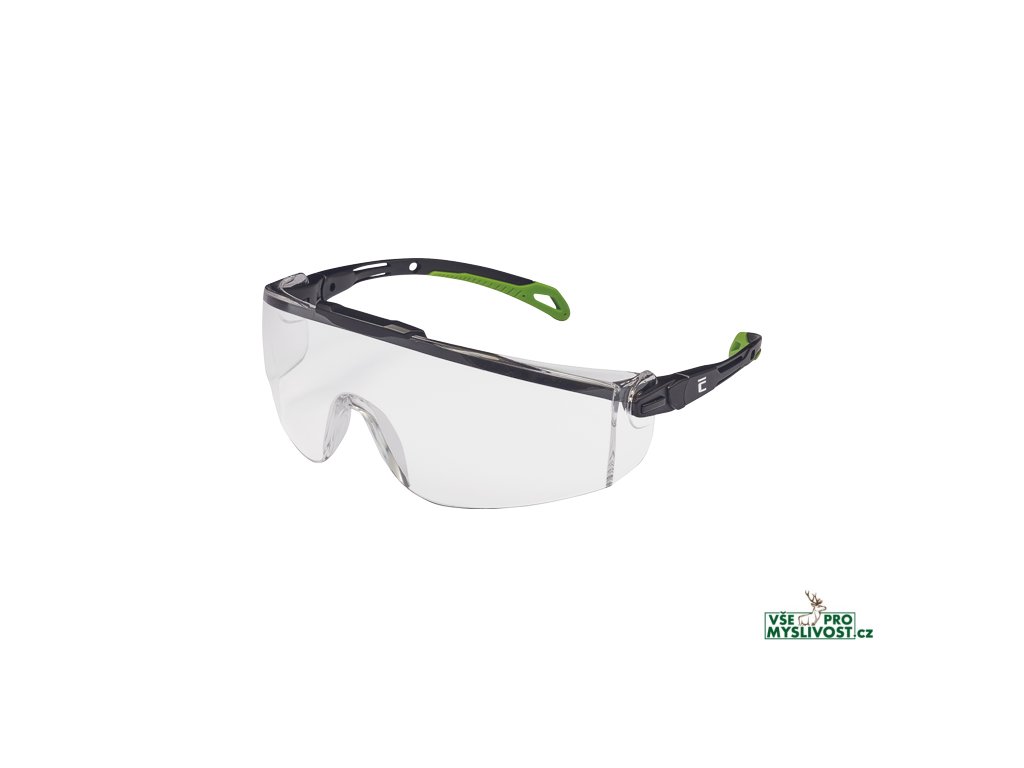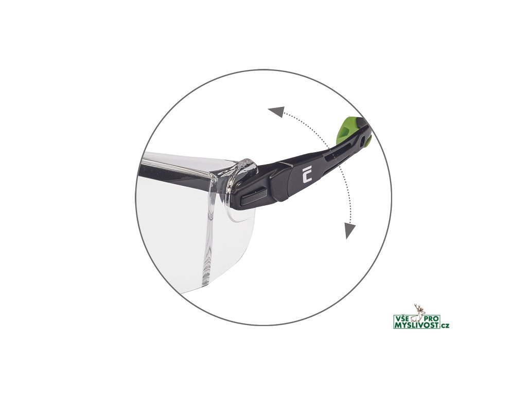 brýle s polykarbonátovým zorníkem třídy 1FT dle normy EN 166; zorník s ochranou proti poškrábání a zamlžení; ochrana proti letícím částicím s nízkou energií; nastavitelný úhel stranic