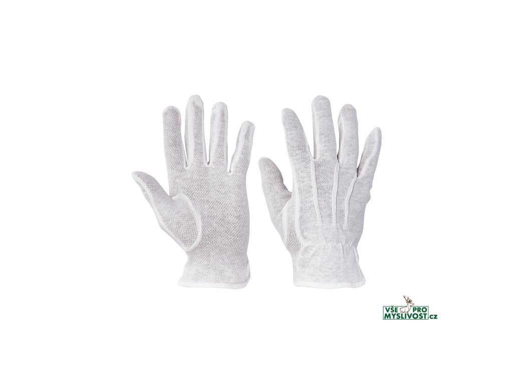 • rukavice šité z bavlněného úpletu • s PVC terčíky v dlani a na prstech • pružinka na horní části zápěstí • bez manžety