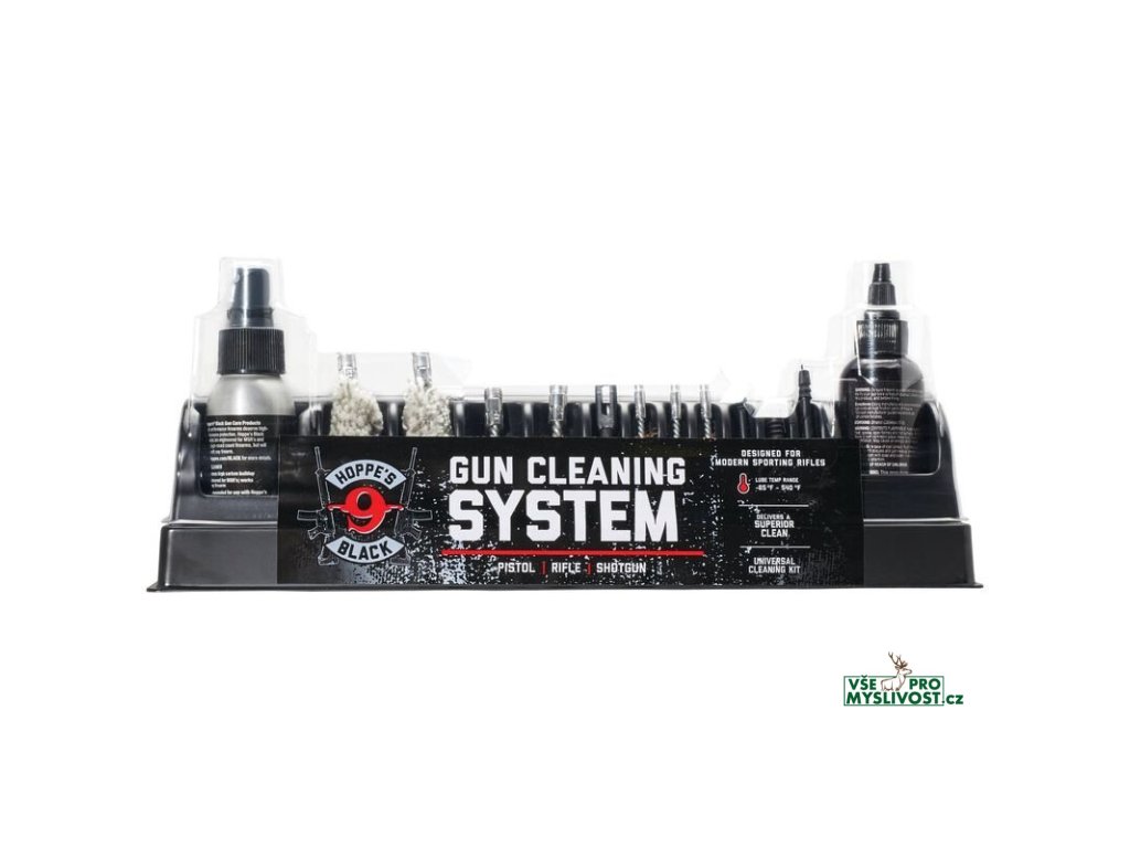 Univerzální čisticí sada Hoppe's Black obsahuje přesný čisticí prostředek Hoppe's Black, olej a nástroje k čištění střelných zbraní po dlouhých dnech na střelnici.