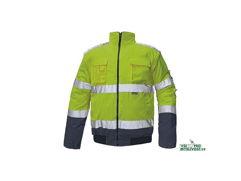 • pánská HI-VIS zimní nepromokavá bunda s odepínatelnými rukávy • kapuce integrovaná v límci • prodyšná • podlepené švy • 3M reflexní pruhy okolo pasu a rukávů • 2 boční kapsy • 2 náprsní kapsy • 1 malá kapsa na levém rukávu • nastavitelná šířka rukávů pomocí druků • elastický pas
