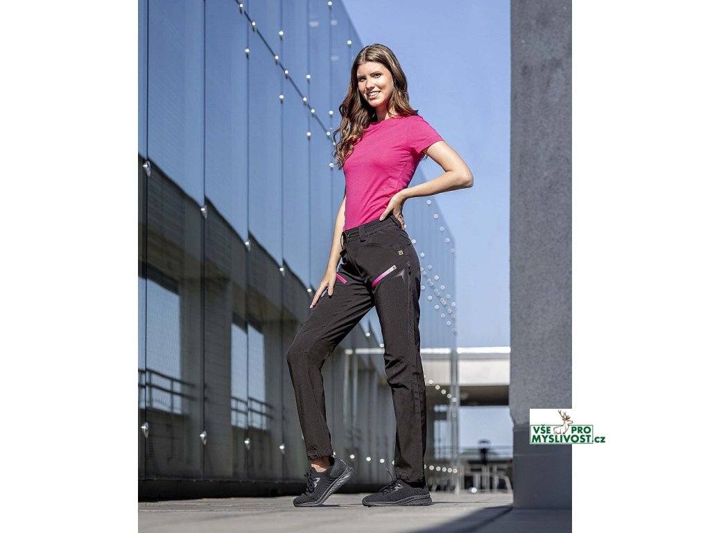 Dámské softshellové kalhoty mají přiléhavý střih SLIM FIT. Čtyřsměrně elastický odlehčený softshell ElasticTech®Flexi s membránou je vhodný i pro náročné aktivity, výborně chrání před větrem, je voděodolný, rychle schne a udržuje optimální tělesnou teplotu. Ventilační zipy se síťovinou na vnější straně stehen. Zadní díl člení sedlo, na předním dílu 2 zipové kapsy, pružný, tvarovaný obvod pasu zvyšuje komfort při nošení. Funkční tvarování nohavic, zúžený střih, spodní lem nohavic s možností nastavení obvodu pomocí druků, vnitřní háček s gumou pro upevnění nohavic k obuvi. Design dokreslují 3D reflexní potisky.