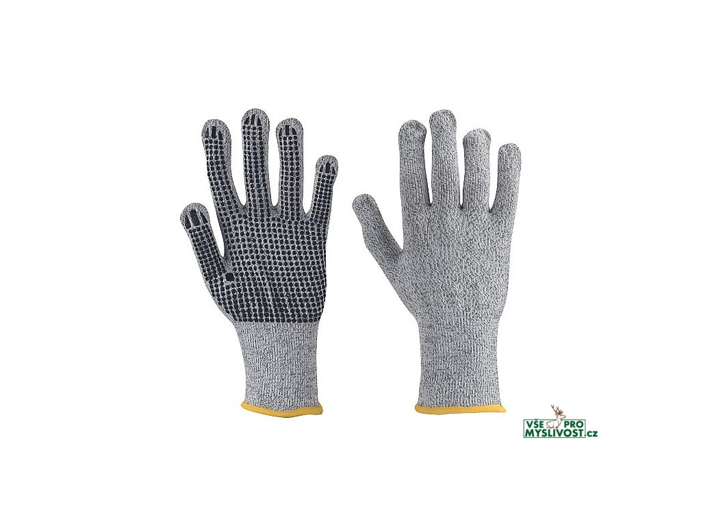 • pletené bezešvé rukavice z modifikovaného skleněného vlákna, Spandexu a nylonu • s PVC terčíky v dlani a na prstech • odolnost proti prořezu kategorie C