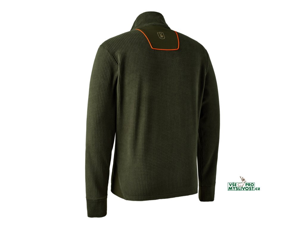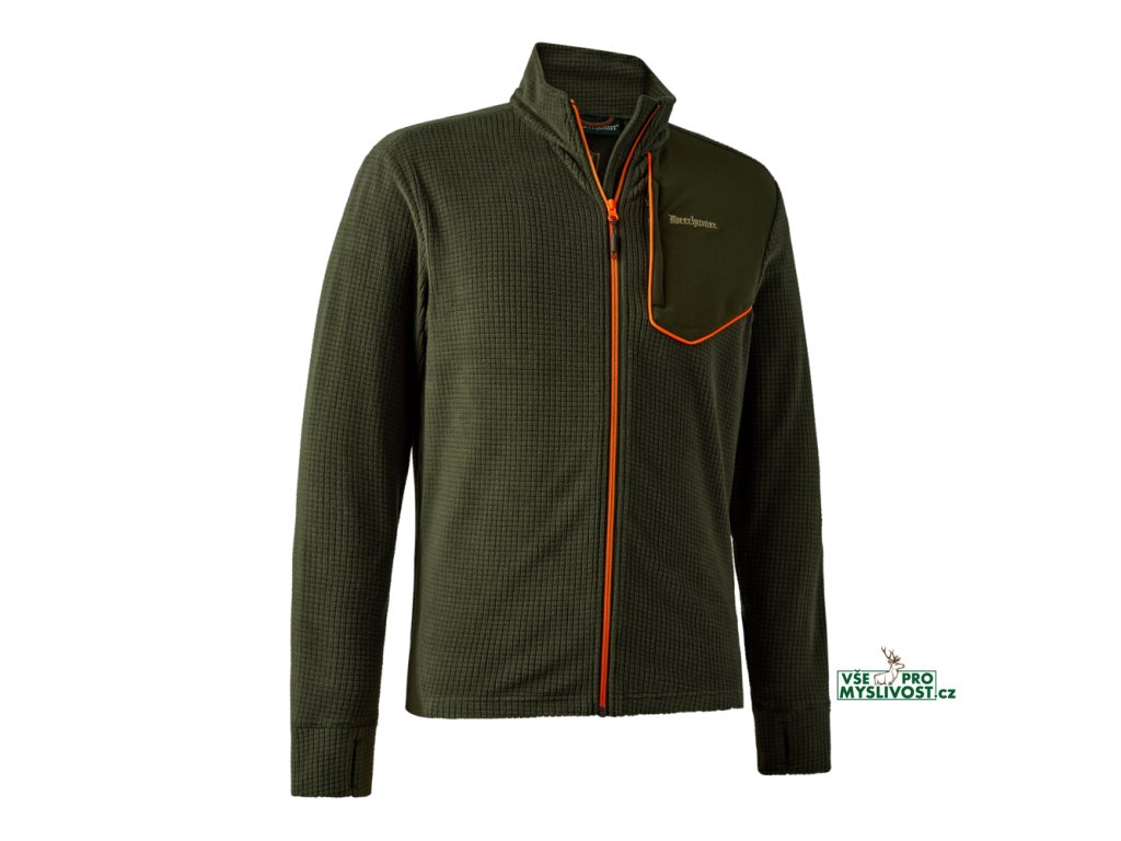 Oranžové detaily Mřížkový fleece s kontrastní látkou Pružná tkanina pro vysoký komfort Náprsní kapsa se skrytým zipem Otvory pro palce