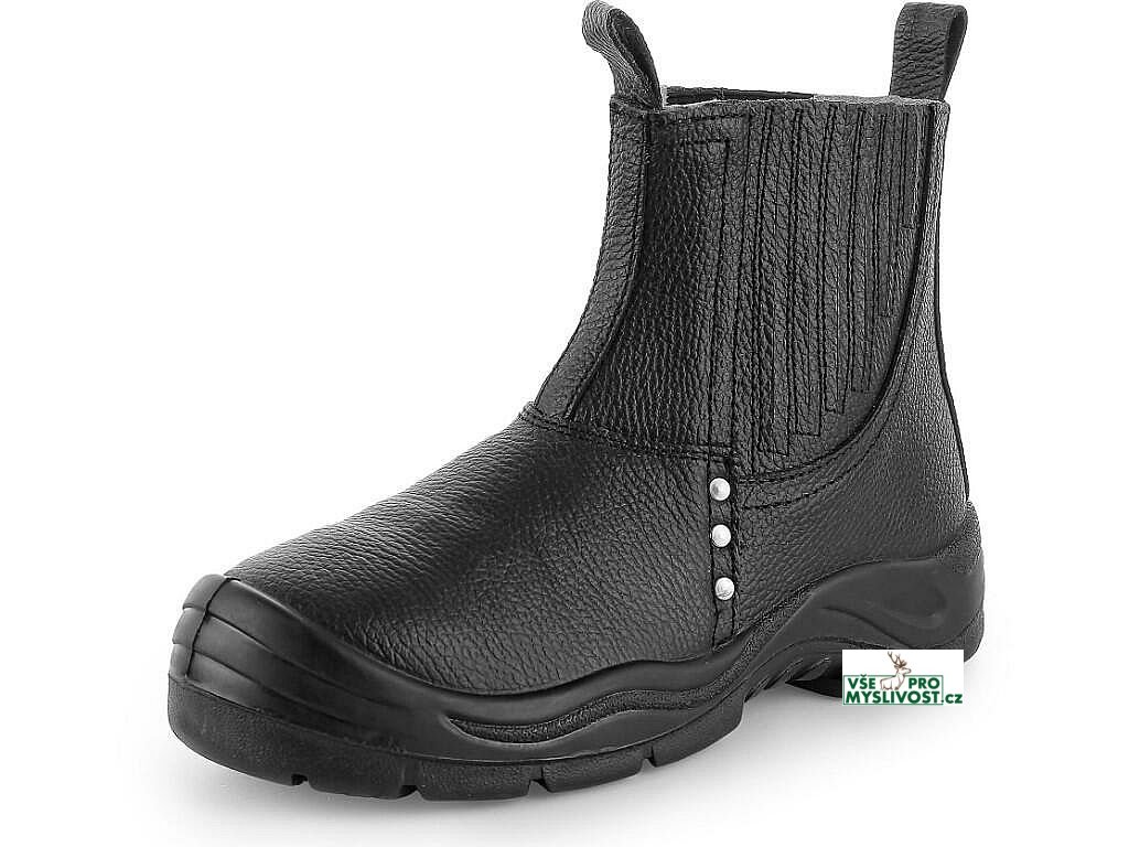 Kotníková obuv s krytou pružinkou, celokožená, materiál: svršek z kvalitní, hrubé tištěné kůže s ocelovou špicí, krytá pružinka z pružné gumy, PU-guma, antistatická, olejivzdorná, protiskluzová podešev, odolná vůči kontaktnímu teplu do 300 °C.