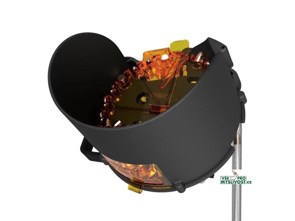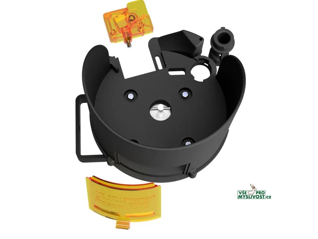 - Přepracovaná boční stěna je nyní vybavena průhledným okénkem, které umožňuje sledovat množství střel ve spodní části násypky podavače. Toto okénko lze navíc bez námahy otevřít jednou rukou, což uživateli umožňuje umístit pod něj zásobník pro rychlé vyprázdnění násypky při výměně ráže. Nový materiál bočních stěn násypky rovněž přispívá ke snížení provozní hlučnosti. - U oblíbených ráží 9 mm a .223 je deska (plate) násypky vyrobena z lehkého materiálu metodou tlakového vstřikování plastů („Injection molded“), která zlepšuje podávání střel a snižuje hmotnost. Tento plate má rovněž středový výstupek, který usnadňuje její vyjmutí při změně ráže. U ostatních ráží, jako je .40/45/.308, se nadále používají strojově obráběné desky z PVC. - Přednastavitelné vodítko podavače střel Mr.Bulletfeeder umožní mikroregulaci hloubky a rychlé dosažení dokonalého nastavení pro konkrétní typ střely a ráže. Již není třeba používat volné distanční podložky Nose-Guide Spacers, které se tak často ztrácely mezi výměnami ráží. Nyní se hloubka nastavuje pouhým otočením šroubku. - Nově navržená otočná rampa, která je nyní širší a obsahuje postupné změny úhlu, eliminuje nutnost upravovat polohu rampy při přechodu mezi jednotlivými typy střel nebo rážemi. Zůstává na svém místě, což zjednodušuje proces výměny ráže. - Nový bajonetový konektor pro sestavu výstupní trubice umožňuje rychlejší demontáž bez použití nářadí. - K závěsné sestavě byla přidána deska s ukazatelem úhlu, která uživatelům poskytuje jasný referenční bod pro důsledné nastavení násypky v požadovaném úhlu. - Mezi další drobná vylepšení patří větší štěrbina na nečistoty pod diskem, pryžové podložky v závěsu pro ochranu boku podavače nábojnic, vylepšená spojovací svorka pro výstupní pružinu a zařazení západky pro usnadnění manipulace s ramenem pro vyjmutí nebo vložení disku.