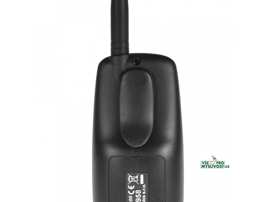 - zobrazení displeje: úroveň stimul. impulsu, zvolený obojek 1 nebo 2, stav baterie vysílače, vysílání povelu