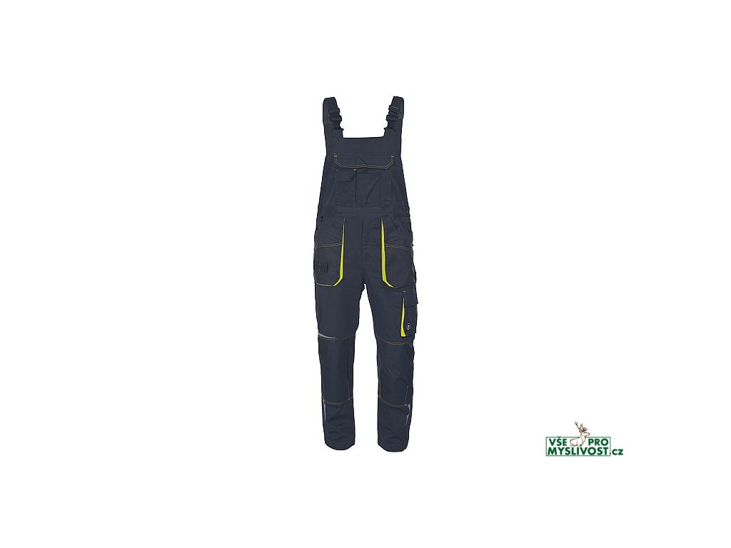 • pánské pracovní vysoce odolné strečové kalhoty s laclem • elastický pas • multifunkční kapsy • 1 velká náprsní kapsa • Oxford 600D zesílení kolenních kapes pro vložení chráničů kolen • tištěné reflexní segmentové detaily • nastavitelná délka nohavic