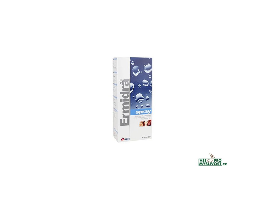 Ermidrá® spray je rehydratační sprej s glukonátem zinku a extraktem vrbovky pro psy a kočky. Vhodný je v případech jakékoliv dehydratace kůže (v letním období, dlouhodobý pobyt v uzavřeném a vytápěném prostoru, po každém šamponování) při narušení normální fyziologické rovnováhy hydrolipidového filmu kůže. Podpora při léčbě akutní sebborhoe. Pro psy, kočky a všechny domácí zvířata, které potřebují hydrataci kůže. Epilobium angustifolium, Vrbovka úzkolistá, bohatá na adstringentní taníny, reguluje produkci mazu. Je známá pro své uklidňující, změkčující a antimikrobiální účinky. Glukonát zinku snižuje překrvení a působí sebo-normalizačně. Cyklodextriny působí stabilizačně a emulgačně. D-panthenol je obsažen v cyklodextrinech, má elastickou funkci a normalizuje obsah vody v kůži a srsti. Lipozomy, jejich mikrokapsuly penetrující do hlubších vrstev kůže, postupně uvolňují hydratačně působící látky.Jak použít Ermidrá® spray: