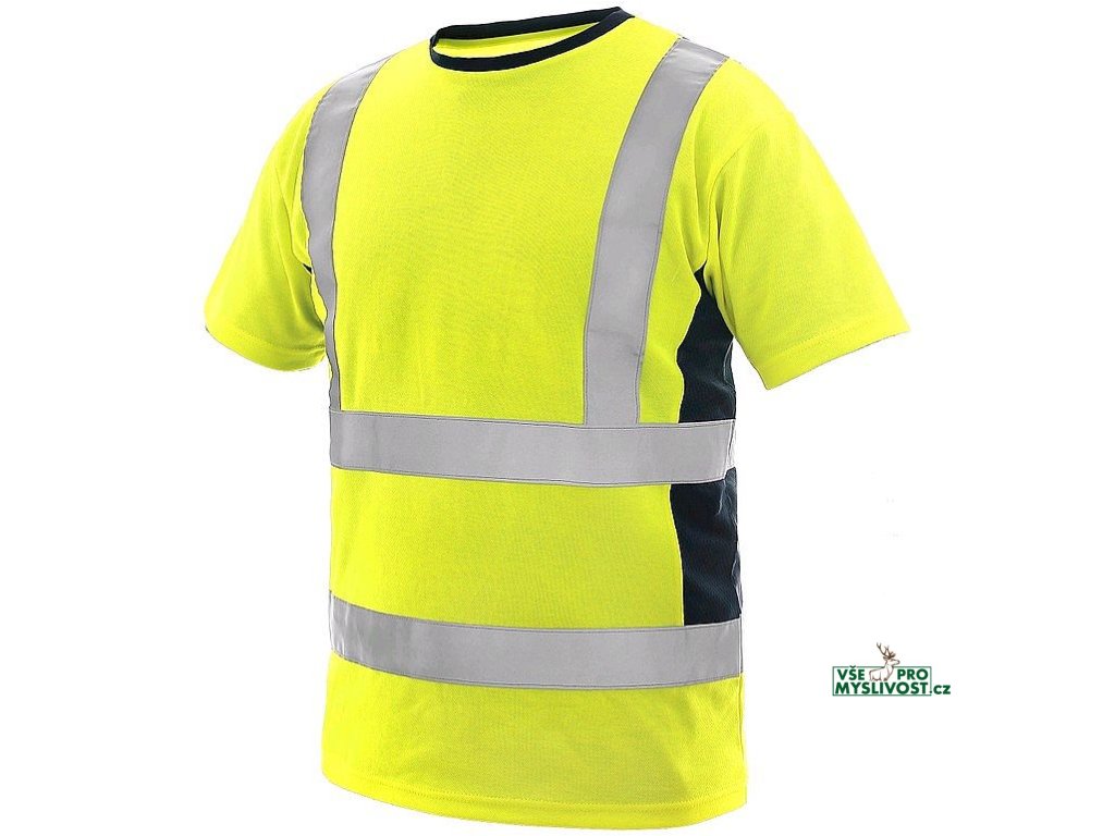 Pánské výstražné tričko s krátkým rukávem, kulatý průkrčník v modré barvě, zpevňující krční páska, boční švy, reflexní pruhy: 2 horizontální, 2 vertikální (šíře 5 cm), boční panely ze síťoviny v modré barvě. Doporučené použití: stavebnictví, silničáři, řidiči, logistika, údržba, kolo, motorky, skladování.
