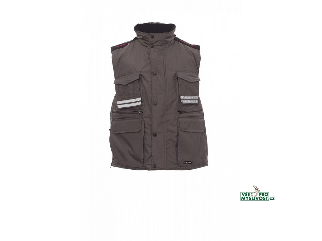 Pánská vesta s 8mm plastovým zipem s kovovým jezdcem zakrytým klopou s plastovými knoflíky, odepínatelná tvarovaná kapuce v límci, šedé reflexní pruhy na přední a zadní straně, boční rozparky s klínkem a zipem, devět vnějších kapes, dvě s LOCK SYSTEMem, dvě na zip a s vnitřní výztuží, jedna s oboustranným pouzdrem na jmenovku. Vnitřek: zateplený, mikroflísový límec, více zateplená záda a spodní část, stahovací šňůrka v pase a zip na vnitřní straně pro snadnější potisk a vyšívání.