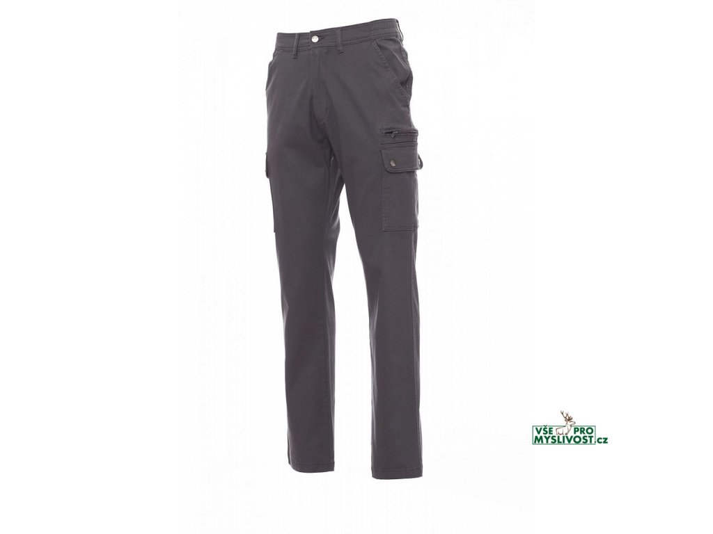 Pánské kalhoty, streč, celoroční, elastické pásky na bocích a poutka v pase, zapínání na zip a na kovový knoflík, dvě přední kapsy klasického střihu, dvě postranní kapsy s klopou a druky, jedna kapsa na zip po levé straně, skrytá kapsa na svinovací metr po pravé straně, dvě zadní prostřižené kapsy s knoflíkovou dírkou a knoflíkem.