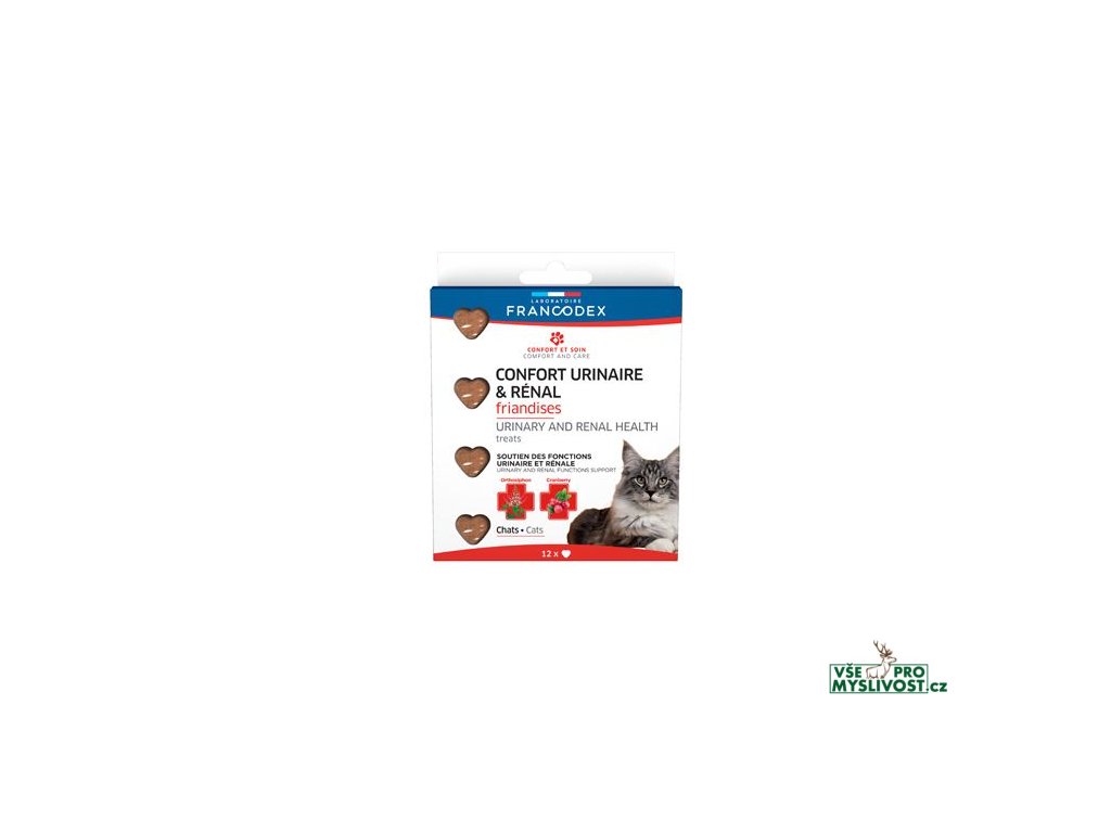 Kočky přirozeně pijí velmi málo. Omezená fyzická aktivita, věk, stres a nadváha jsou některé z faktorů, které mohou vést k rozvoji močových a ledvinových problémů. Pochoutky Francodex Urinary and Renal obsahují brusinky používané při potížích s močením a ortosifon, který podporuje dobrou funkci ledvin. Pamlsky jsou ve tvaru srdce s jemnou texturou, navrženy tak, aby je snadno požívaly všechny typy koček.