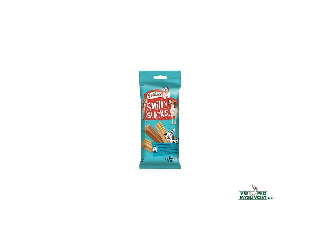 Doplňkové krmivo Frolic pochoutka Smiley Sticks je žvýkací pochoutka pro péči o chrup. Výrobek je určen ke žvýkání a je vhodný pouze pro psy o hmotnosti 5kg a více a psy starší 4 měsíců. Tato pochoutka neobsahuje umělá barviva ani příchutě. Příchuť kuřecího a hovězího masa potěší chuťové pohárky každého psího gurmána.