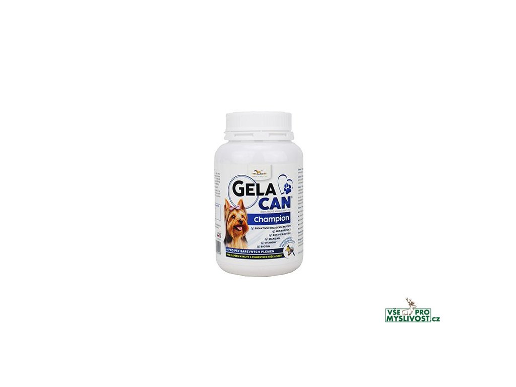 GELACAN CHAMPION BAREVNÝ - SRST - PIGMENTACE - BAREVNÁDoplňkové krmivo dodávající organismu komplexní soubor látek napomáhající zdravé výživě kůže a srsti, jejímu růstu a kvalitě, přispívající ke zlepšení pigmentace srsti a nosní houby a zlepšující celkovou kondici psa.