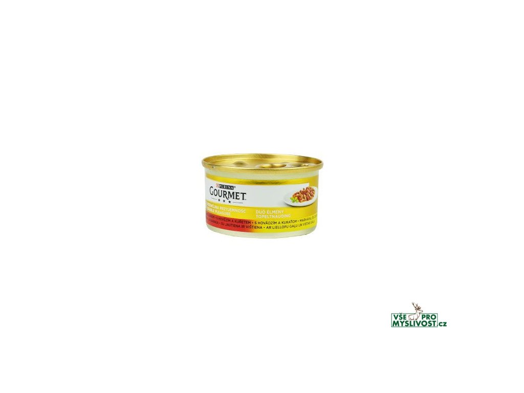 Kompletní, superprémiové krmivo Gourmet Gold konz. pro dospělé kočky všech plemen, s obsahem dušeného hovězího a kuřecího masa.