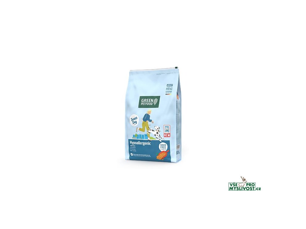 Ideální alternativa pro ty psí jedince, kteří trpí alergiemi intolerancemi na běžné druhy mas nebo masitou stravu: Green Petfood InsectDog hypoalgenní obsahuje 100% hmyzí bílkoviny, která slouží jako zdroj kvalitních stavebních kamenů bílkovin a mastných kyselin. Hmyz se do krmiv pro psy používá velmi zřídka, krmivo je tak hypoalergenní a výborně ho snáší i velmi citlivá zvířata. Chov hmyzu navíc způsobuje nízké emise CO2 a proto je výroba krmiva šetrná k životnímu prostředí. Kromě hmyzí bílkoviny, která představuje jedinečný zdroj živočišných bílkovin, obsahuje krmivo zeleninu, slunečnicový olej a vyváženou kombinaci životně důležitých látek. Obiloviny nejsou v krmivu obsaženy. Organismus psa tak bude zásoben potřebnými vitamíny, minerálními látkami a stopovými prvky. Krmivo obsahuje prvotřídní suroviny a při výrobě nebyly použity žádná barviva, ochucovadla či konzervační látky.