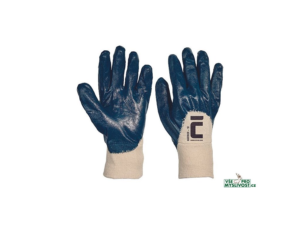 • rukavice šité z bavlněného úpletu • polomáčené v nitrilu • s pružným nápletem