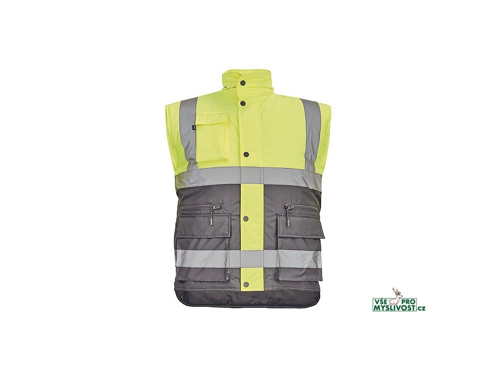 • pánská zateplená HI-VIS vesta s reflexními pruhy přes ramena a v bocích • kapuce skrytá v límci • zapínání na zip kryté légou se zapínáním na druky • 2 přední multifunkční kapsy s klopou a zapínáním na zip • 1 náprsní kapsa s klopou