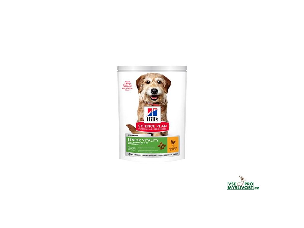 HILL'S SCIENCE PLAN Senior Vitality krmivo pro malé a trpasličí psy s kuřetem a rýží poskytuje přesně vyváženou výživu, která podporuje každodenní energii a vitalitu Speciální směs ingrediencí podporuje funkci mozku, interakci, energii a vitalitu Omega-3 a -6 mastné kyseliny pro krásnou srst. Lehce stravitelné ingredience pro zdravé zažívání.Doporučeno pro: