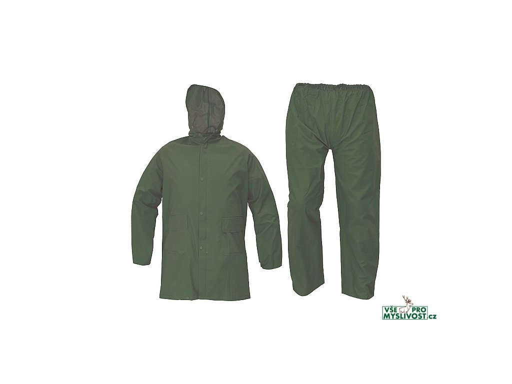 • voděodolný dvoudílný oblek • ¾ plášť s kapucí a kalhoty v pase na gumu • všechny spojovací švy jsou zatavené • materiál s nánosem PVC • dvě přední kapsy kryté légami proti průniku vody • spodní část rukávů lze regulovat drukem • ventilace na zádech a v podpaží