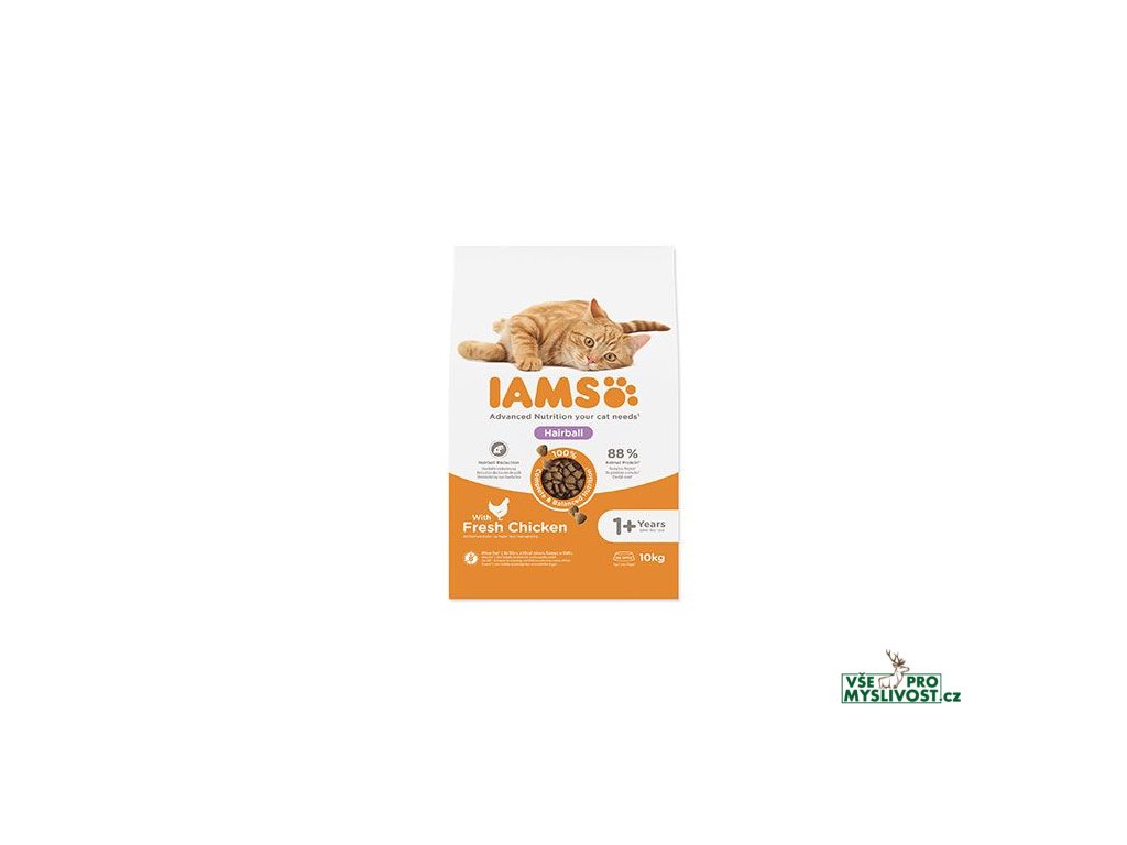 Krmivo IAMS for Vitality pro redukci chlupových bezoárů pro dospělé kočky a kočičí seniory je 100% kompletní a vyvážené, odborníky sestavené krmivo, které bude vašemu zvířeti chutnat a svědčit. Naše nová a vylepšená receptura s čerstvým kuřecím masem je založena na kvalitních živočišných bílkovinách pečlivě vybraných tak, aby u dospělých koček a kočičích seniorů podporovaly sedm znaků zdravé vitality. Aby byly kočky zdravé, aktivní a plné energie, přidáváme do svých lahodných receptur až 89 % živočišných bílkovin (z celkového obsahu bílkovin). Naše receptura pro omezení tvorby chlupových bezoárů pomáhá kočce tyto potíže lépe zvládat.Naším závazkem je nabídnout kočkám specializované krmivo se skvělou chutí, které si váš domácí mazlíček bezvýhradně zamiluje a které bude podporovat všech sedm znaků zdravé vitality. Oproti našemu běžnému krmivu IAMS pro dospělé kočky s čerstvým kuřecím masem pomáhá tato receptura snižovat tvorbu chlupových bezoárů až dvakrát efektivněji. Díky vyváženému obsahu omega-3 a omega-6 mastných kyselin v krmivu IAMS budete moct obdivovat zdravou kůži a lesklou srst svého zvířete. Své receptury jsme vyvinuli tak, aby snižovaly pH v močové soustavě a udržely ji zdravou. Připravte se, že vaše kočka bude skákat a řádit. To díky kvalitním bílkovinám a nezbytným minerálům, které pomáhají udržet zdravé svaly a kosti. Kombinace antioxidantů s vitamínem E posiluje imunitu, takže ji už při výpravách nic neohrozí. A až ji uslyšíte chroupat naše granule s vyváženým obsahem minerálů v každém soustu, můžete si být jisti, že bude mít silné a zdravé zuby. Při úklidu kočičí toalety oceníte zdravé trávení kočky díky optimální kombinaci vlákniny, prebiotik a řepné dužiny. Naše krmiva navíc obsahují základní živiny, jako např. taurin, pro zdravé srdce, aby vám váš miláček nikdy nepřestal projevovat lásku.