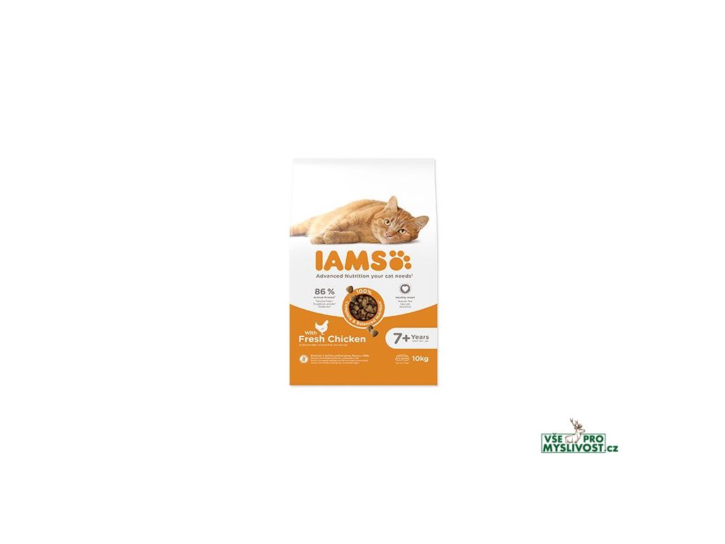Krmivo IAMS for Vitality pro kočičí seniory je 100% kompletní a vyvážené, odborníky sestavené krmivo, které bude vašemu zvířeti chutnat a svědčit. Naše nová a vylepšená receptura pro kočičí seniory s čerstvým kuřecím masem je založena na kvalitních živočišných bílkovinách pečlivě vybraných tak, aby podporovaly sedm znaků zdravé vitality kočky. Aby byly kočky zdravé, aktivní a plné energie, obsahují naše lahodné receptury až 88 % kuřecího masa (z celkového obsahu bílkovin).Naším závazkem je nabídnout kočkám specializované krmivo se skvělou chutí, které si váš domácí mazlíček bezvýhradně zamiluje a které bude podporovat všech sedm znaků zdravé vitality. Při úklidu kočičí toalety oceníte zdravé trávení kočky díky optimální kombinaci vlákniny, prebiotik a řepné dužiny. Připravte se, že vaše kočka bude skákat a řádit. To díky kvalitním bílkovinám a nezbytným minerálům, které pomáhají udržet zdravé svaly a kosti. Díky vyváženému obsahu omega-3 a omega-6 mastných kyselin můžete obdivovat zdravou kůži a lesklou srst kočky. Své receptury jsme vyvinuli tak, aby snižovaly pH v močové soustavě a udržely ji zdravou. Kombinace antioxidantů s vitamínem E posiluje imunitu, takže ji už při výpravách nic neohrozí. A až ji uslyšíte chroupat naše granule s vyváženým obsahem minerálů v každém soustu, můžete si být jisti, že bude mít silné a zdravé zuby. Naše krmiva navíc obsahují základní živiny, jako např. taurin, pro zdravé srdce, aby vám váš miláček nikdy nepřestal projevovat lásku.