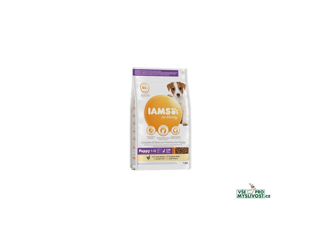 Krmivo IAMS for Vitality pro štěňata malých a středních plemen je 100% kompletní a vyvážené odborníky sestavené krmivo, které bude vašemu štěněti svědčit. Naše nová a vylepšená receptura pro štěňata s čerstvým kuřecím masem je založena na kvalitních živočišných bílkovinách, které byly pečlivě vybrány, aby podporovaly sedm znaků zdravé vitality štěněte. Aby byla štěňata zdravá, aktivní a plná energie, obsahují naše lahodné receptury až 85 % živočišných bílkovin z kuřecího masa (z celkového obsahu bílkovin).Naším závazkem je dopřát štěňatům specializované krmivo se skvělou chutí, které si váš domácí mazlíček bezvýhradně zamiluje a které bude podporovat všech sedm znaků zdravé vitality.