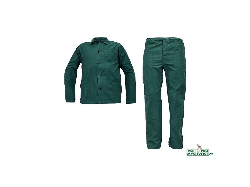 • pánská pracovní souprava • BUNDA - s límcem a zapínáním na knoflíky • 2 přední kapsy • 1 náprsní kapsa • KALHOTY - 2 přední kapsy • 1 zadní kapsu a pas stažitelný na tkaničku