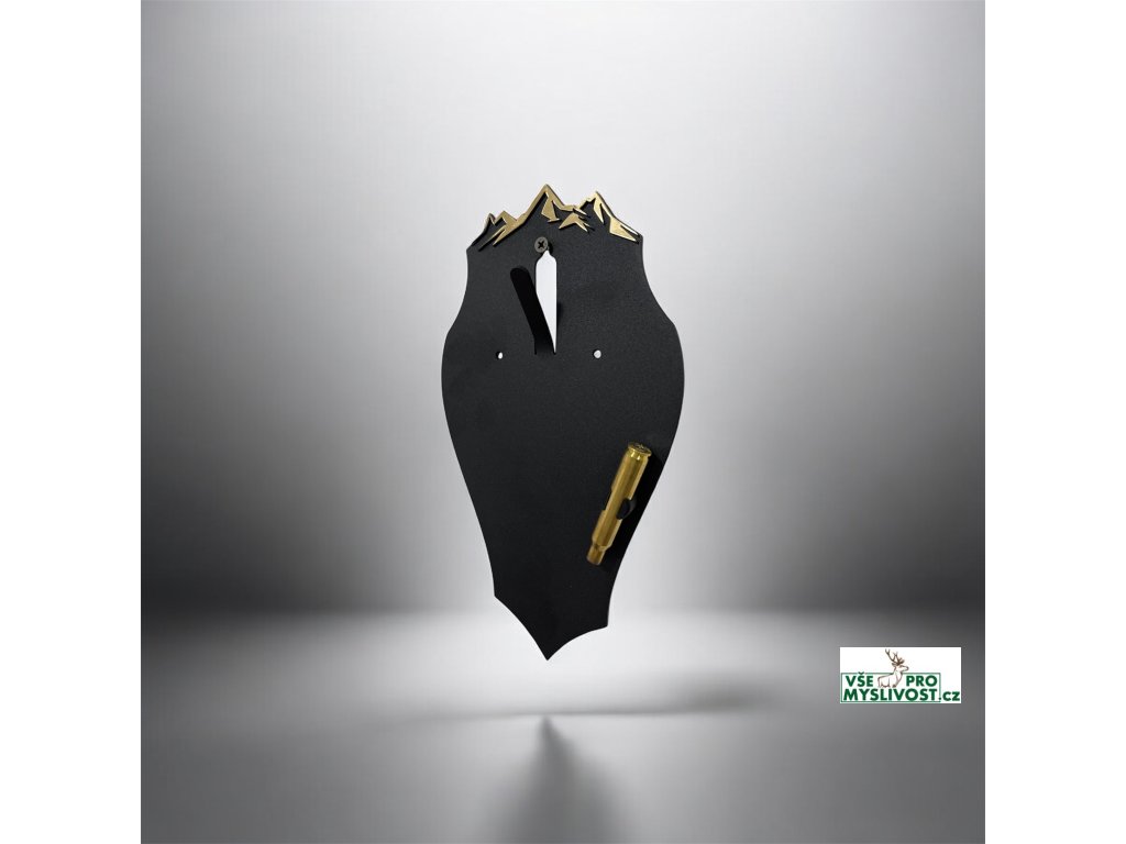 Kovová podložka pod trofej srnce – černý lak, držák na nábojnici, zlatá silueta hor