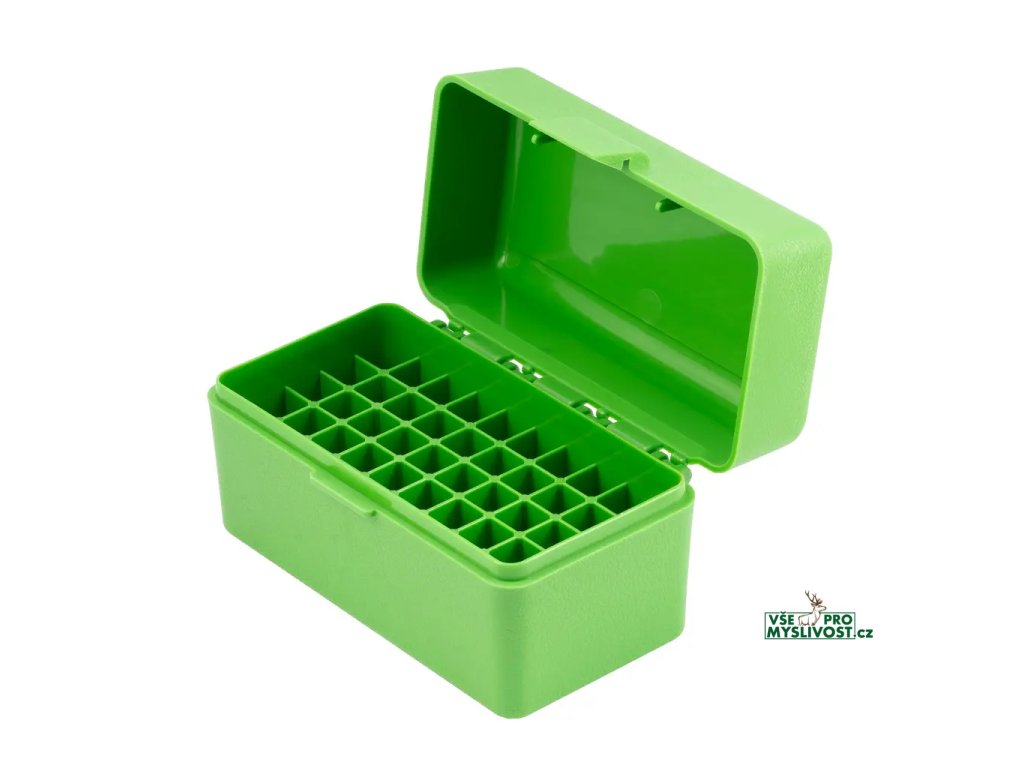 Dobře uzavíratelná krabička na 50 ks nábojů pro vícero ráží. Díky krabičce máte přesný přehled o počtu vystřelených nábojů a kontrolu nad jejich přepravou.